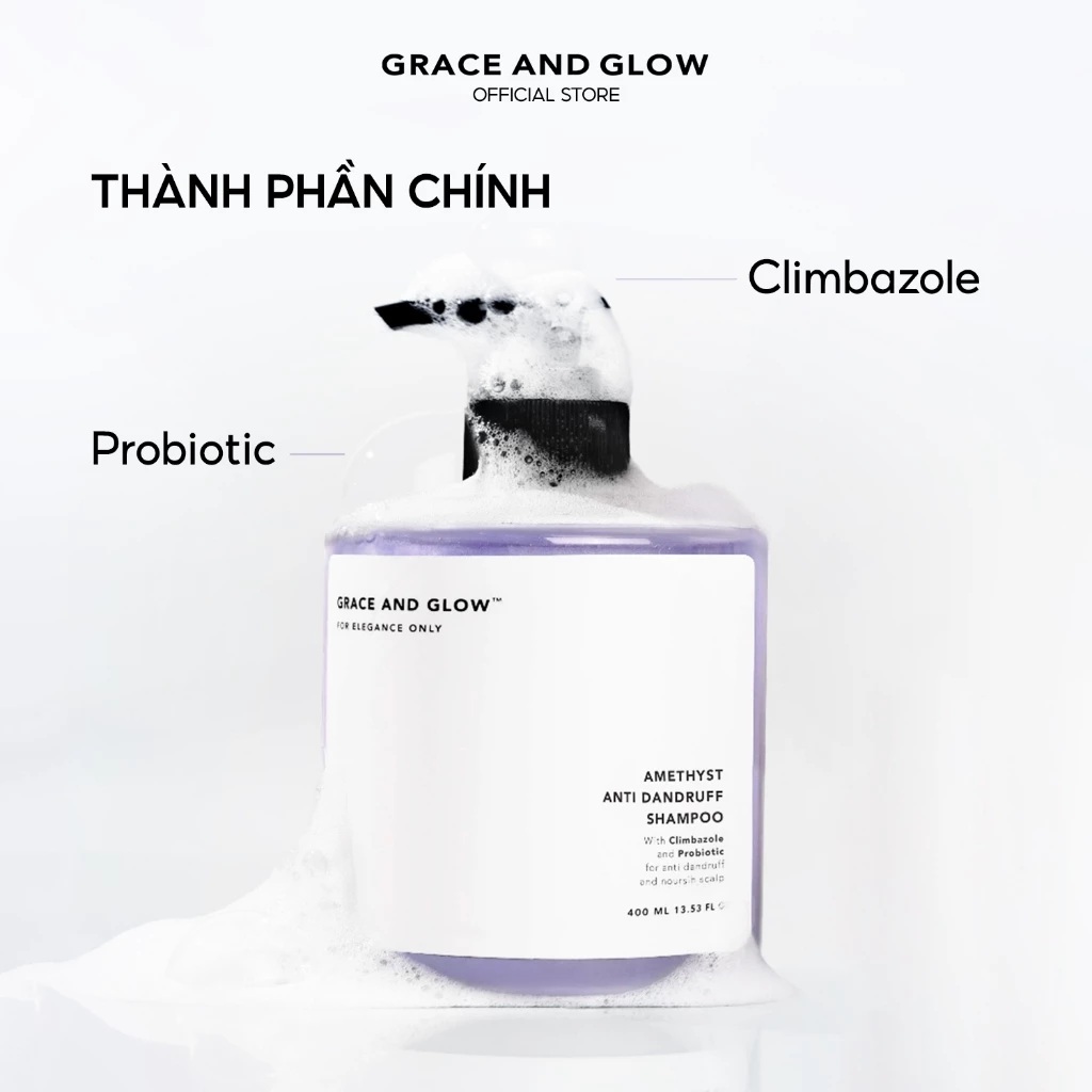 - Grace and Glow Amethyst Anti Dandruff Shampoo là một loại dầu gội đầu chuyên trị gàu và dưỡng da đầu từ thương hiệu Grace and Glow, nổi tiếng với các sản phẩm chăm sóc tóc và da mang hương thơm nước hoa cao cấp. Sản phẩm lấy cảm hứng từ mùi nước hoa sang trọng Omnia Amethyst của Bvlgari, với hương thơm tinh tế, tươi mát kết hợp giữa hoa mâm xôi, cam bergamot và gỗ đàn hương, mang đến trải nghiệm gội đầu thư giãn như spa tại nhà. Với dung tích 400ml, đây là lựa chọn lý tưởng cho việc kiểm soát gàu hàng ngày, giúp da đầu khỏe mạnh, tóc chắc khỏe và giảm ngứa ngáy hiệu quả.